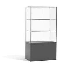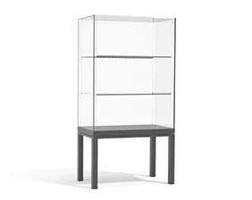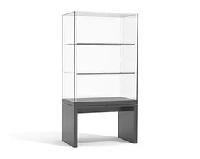 Four-sided, frameless glass display case atop a pedestal base. Available with glass top or with an opaque top for integrated lighting.  Standard features include:  removable interior deck, high-quality locks, hinged door access.